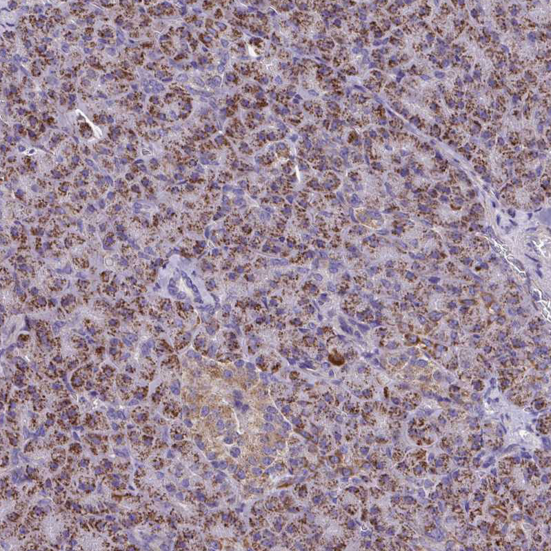 Immunohistochemical staining of human kidney shows strong granular cytoplasmic positivity in cells in tubules.