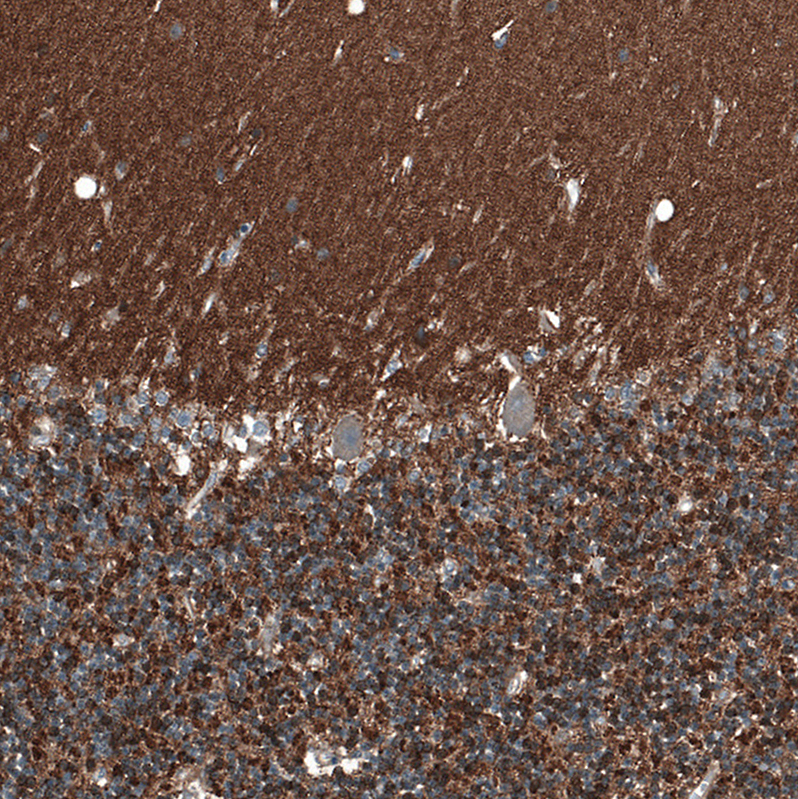 Immunohistochemical staining of human cerebral cortex shows strong positivity in neuropil.