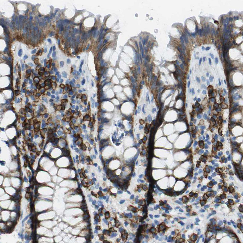Immunohistochemical staining of human skin shows moderate to strong membranous positivity in squamous epithelial cells.