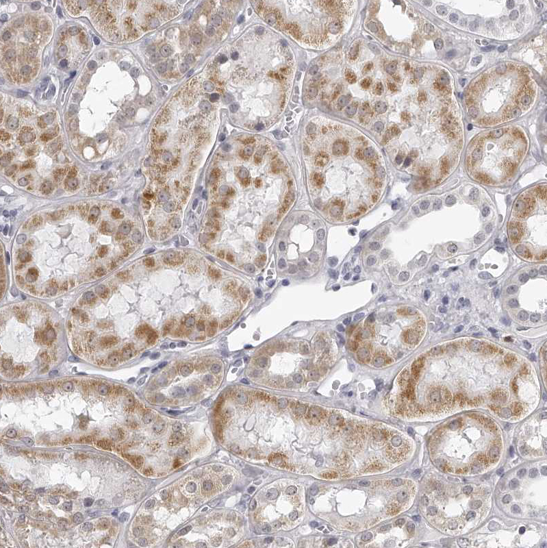 Immunohistochemical staining of human Lymph node shows strong positivity in endoplasmic reticulum in non-germinal center cells.