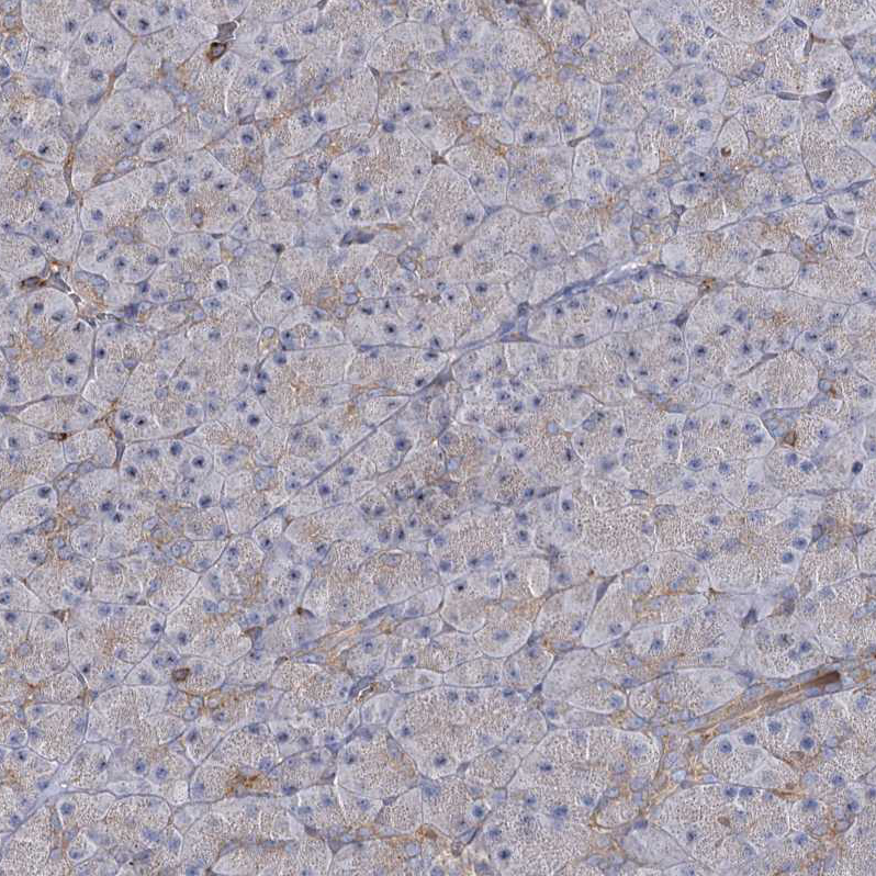 Immunohistochemical staining of human testis shows strong granular cytoplasmic positivity in cells in seminiferous ducts.