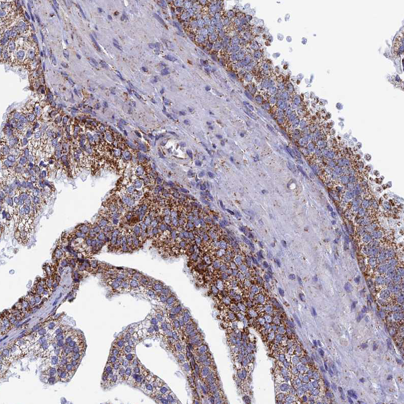 Immunohistochemical staining of human rectum shows strong granular cytoplasmic positivity in glandular cells.