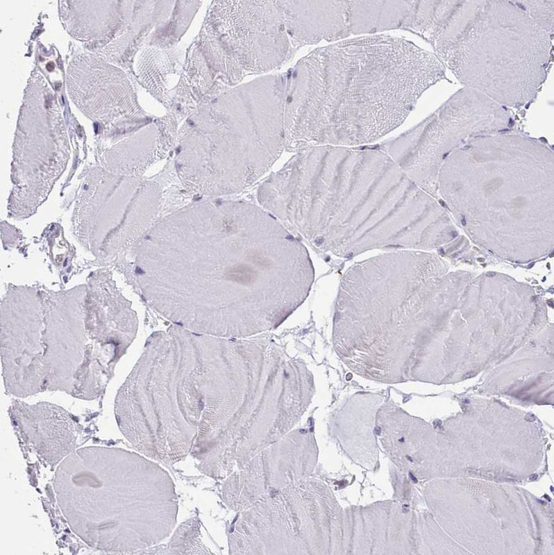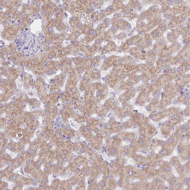 Immunohistochemical staining of human pancreas shows moderate to strong positivity in endoplasmic reticulum in exocrine glandular cells.