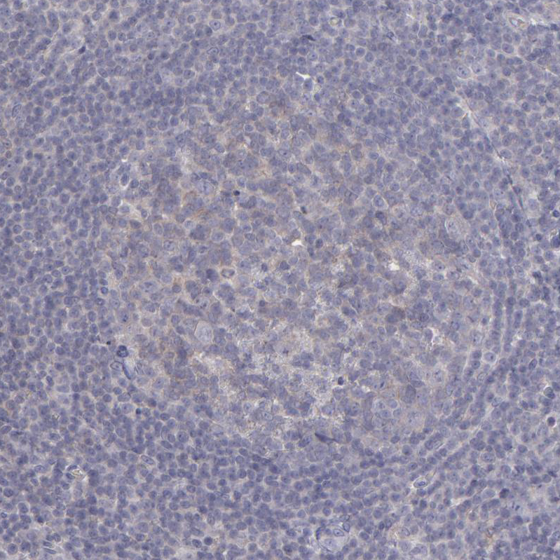 Immunohistochemical staining of human small intestine shows strong cytoplasmic positivity in glandular cells.