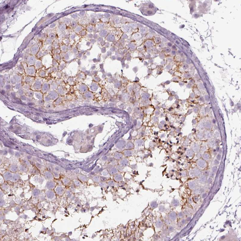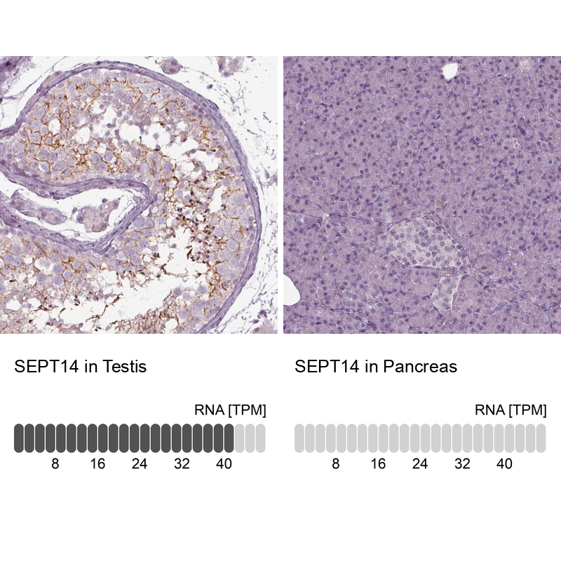 Immunohistochemistry analysis in human testis and pancreas tissues using HPA073255 antibody. Corresponding SEPT14 RNA-seq data are presented for the same tissues.
