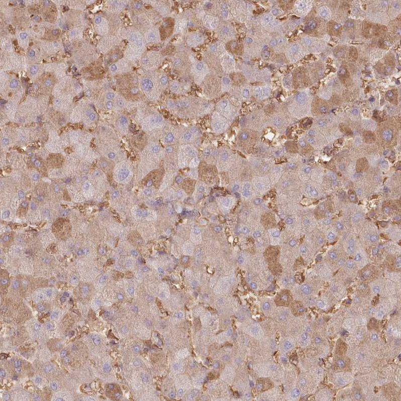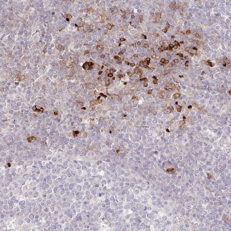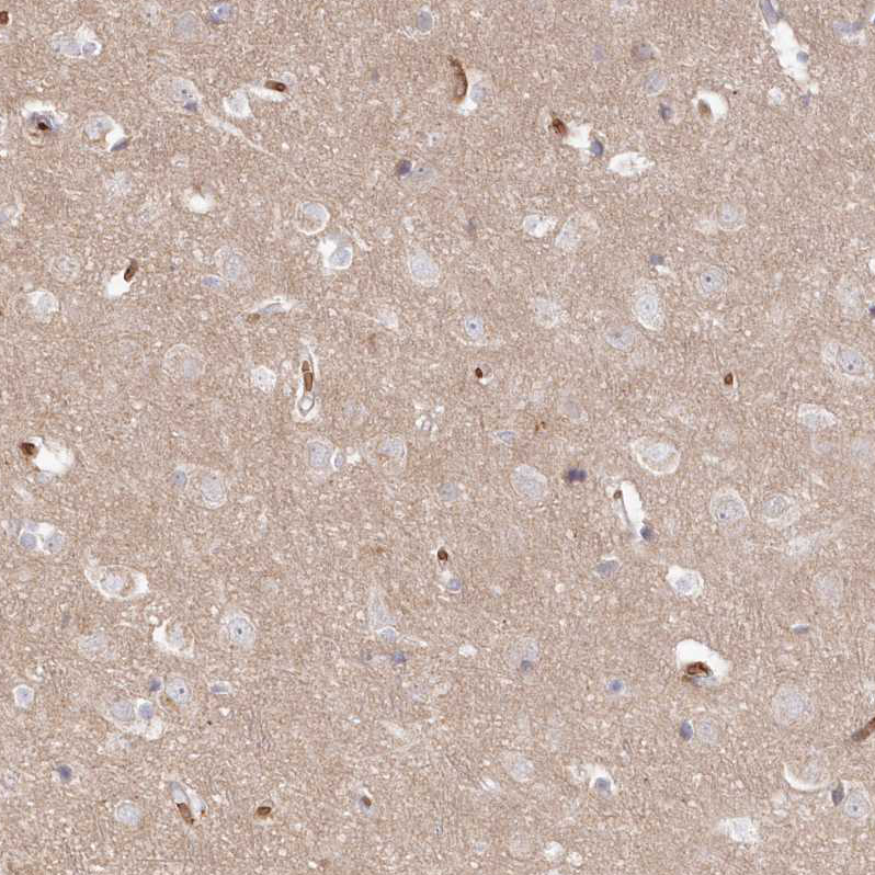 Immunohistochemical staining of human cerebral cortex shows moderate cytoplasmic positivity in neurons.