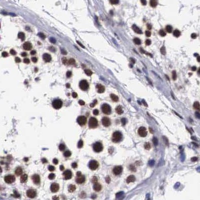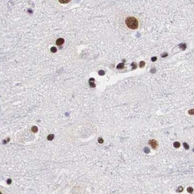 Immunohistochemical staining of human cerebral cortex, colon, kidney and testis using Anti-SF3A1 antibody HPA000690 (A) shows similar protein distribution across tissues to independent antibody HPA030083 (B).