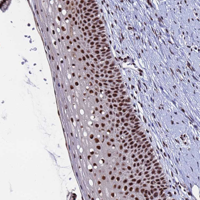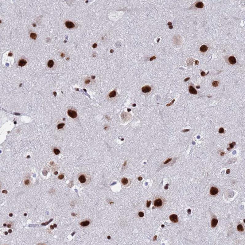 Immunohistochemical staining of human testis shows strong nuclear positivity in cells in seminiferous ducts.