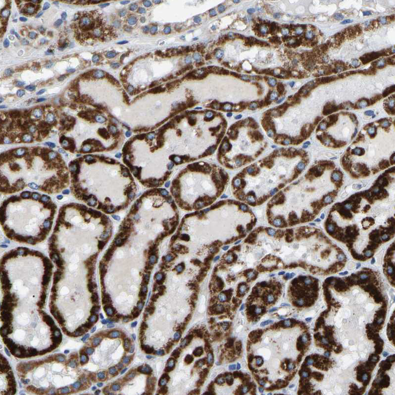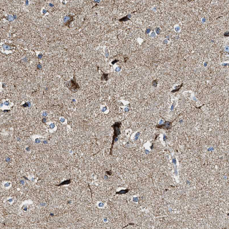 Immunohistochemical staining of human liver shows very strong granular cytoplasmic positivity in hepatocytes.