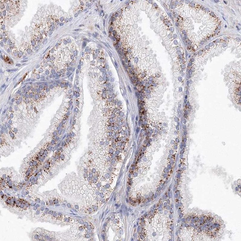 Immunohistochemical staining of human Testis shows moderate granular cytoplasmic positivity in cells in seminiferous ducts.