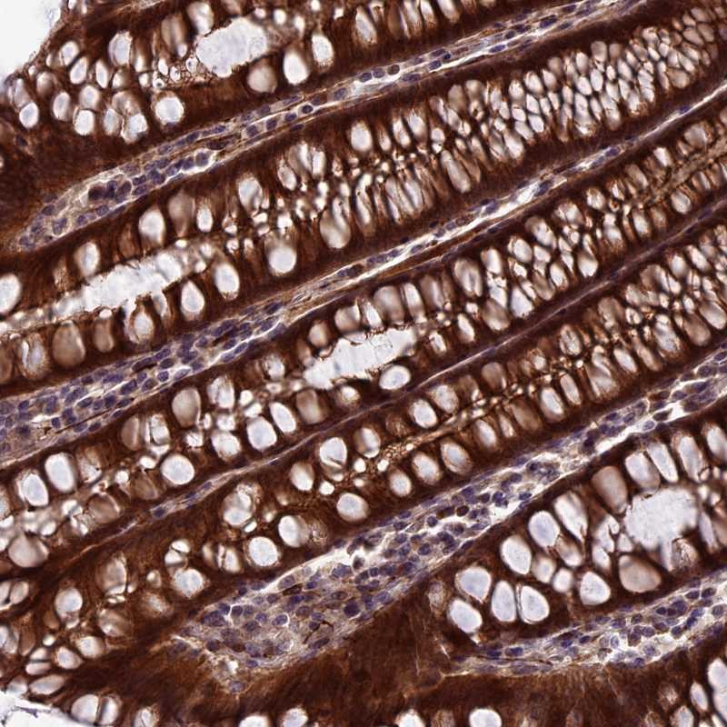 Immunohistochemical staining of human colon shows strong cytoplasmic and membrane positivity in glandular cells.