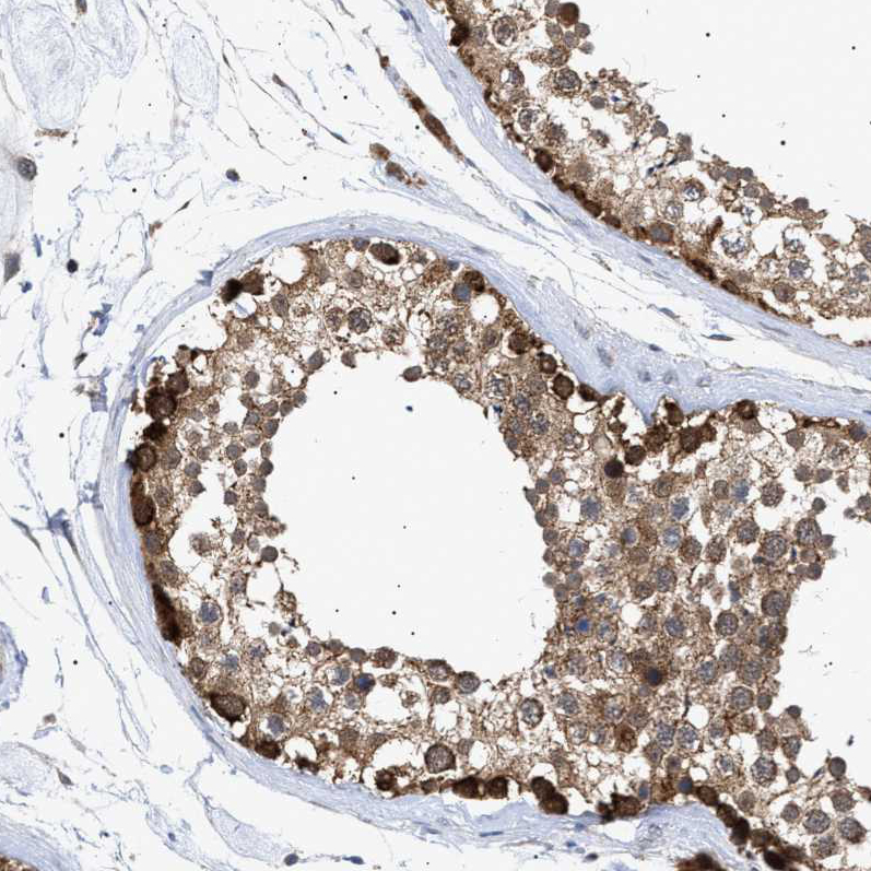 Immunohistochemical staining of human liver shows moderate cytoplasmic positivity in hepatocytes.