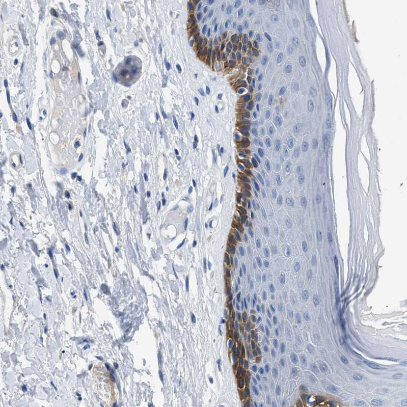 Immunohistochemistry analysis in human skin and lymph node tissues using HPA016662 antibody. Corresponding SLC10A6 RNA-seq data are presented for the same tissues.