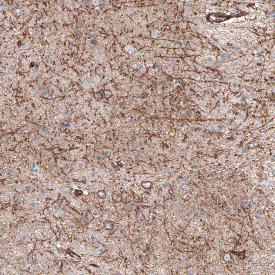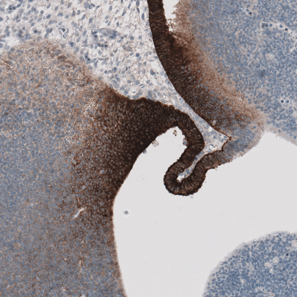 Immunohistochemical staining of human liver shows moderate to strong membranous positivity in hepatocytes.