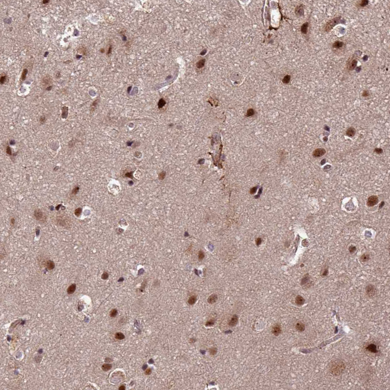 Immunohistochemical staining of human kidney shows moderate cytoplasmic positivity in cells in tubules.
