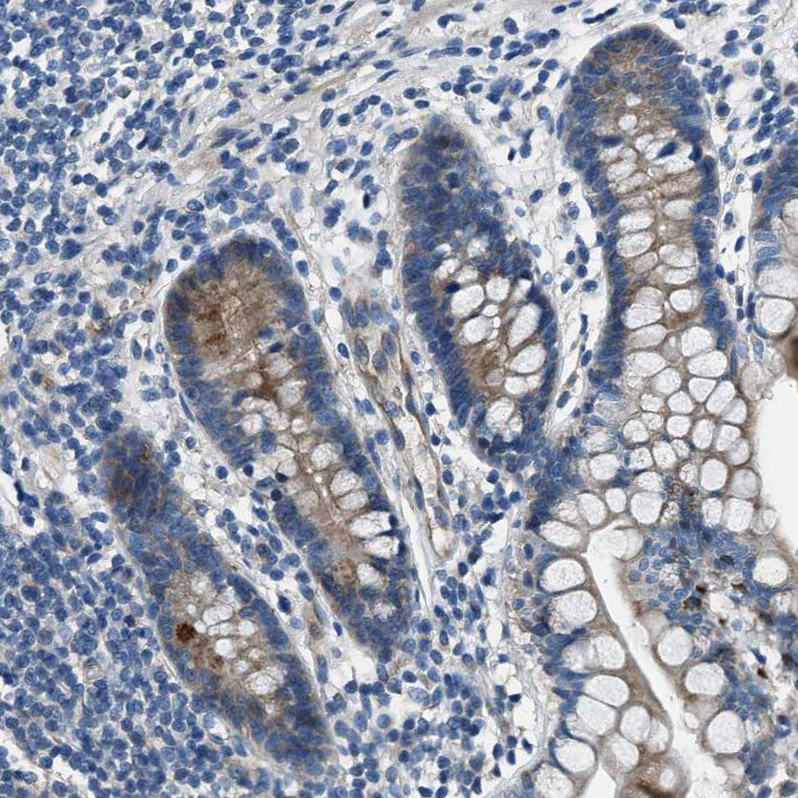 Immunohistochemical staining of human cerebral cortex shows moderate membranous positivity in neurons.