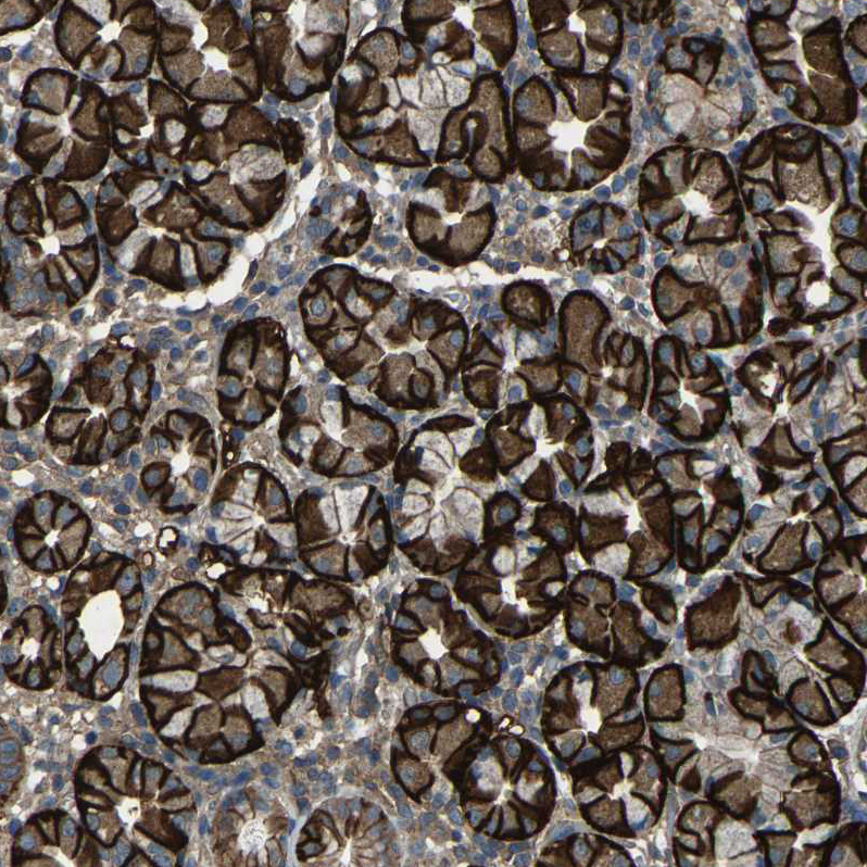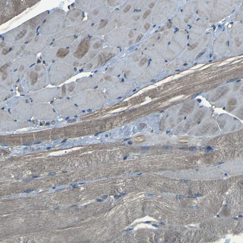 Immunohistochemistry analysis in human stomach and skeletal muscle tissues using HPA019339 antibody. Corresponding SLC4A2 RNA-seq data are presented for the same tissues.