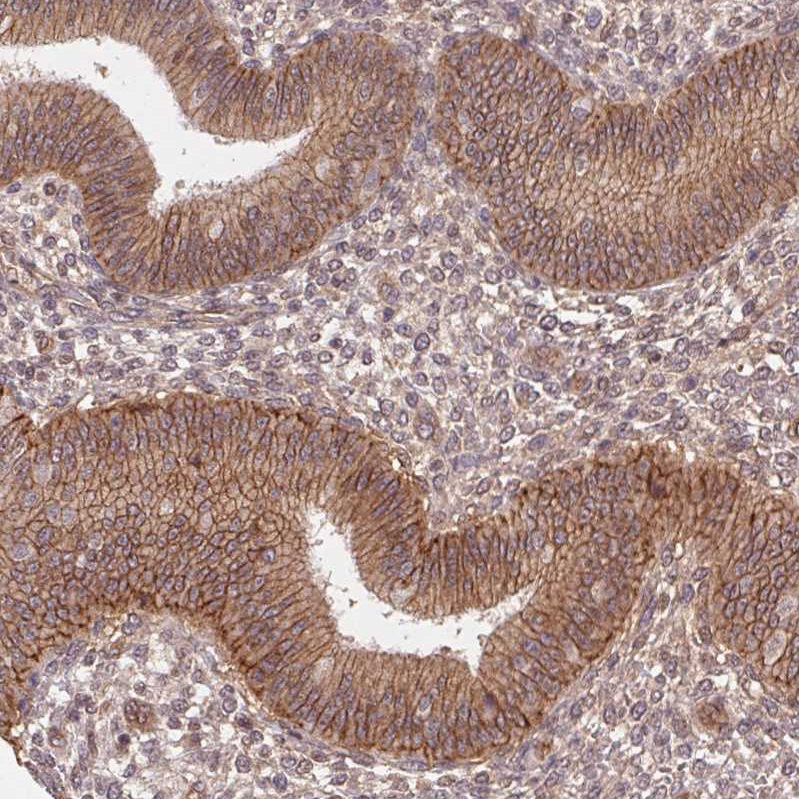Immunohistochemical staining of human duodenum shows strong membranous positivity in glandular cells.