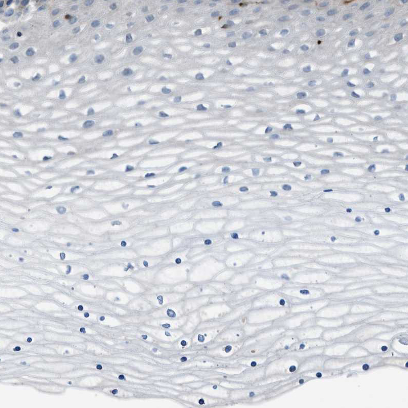 Immunohistochemical staining of human colon shows moderate cytoplasmic positivity in glandular cells.