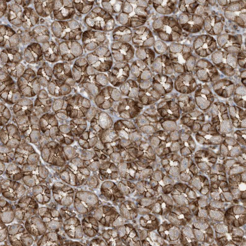 Immunohistochemical staining of human stomach shows strong membranous positivity in glandular cells.