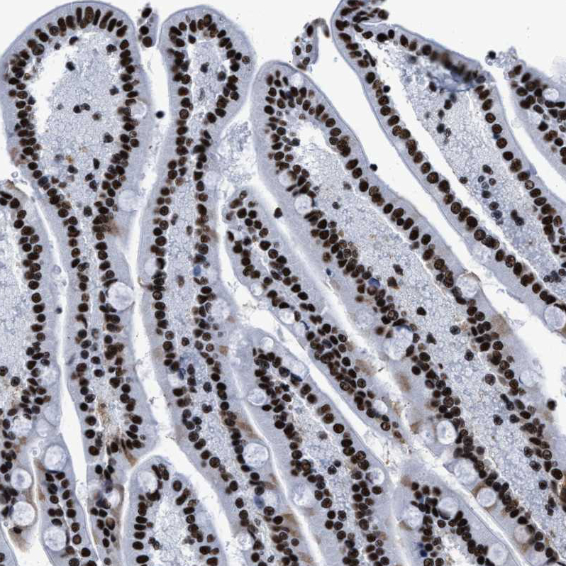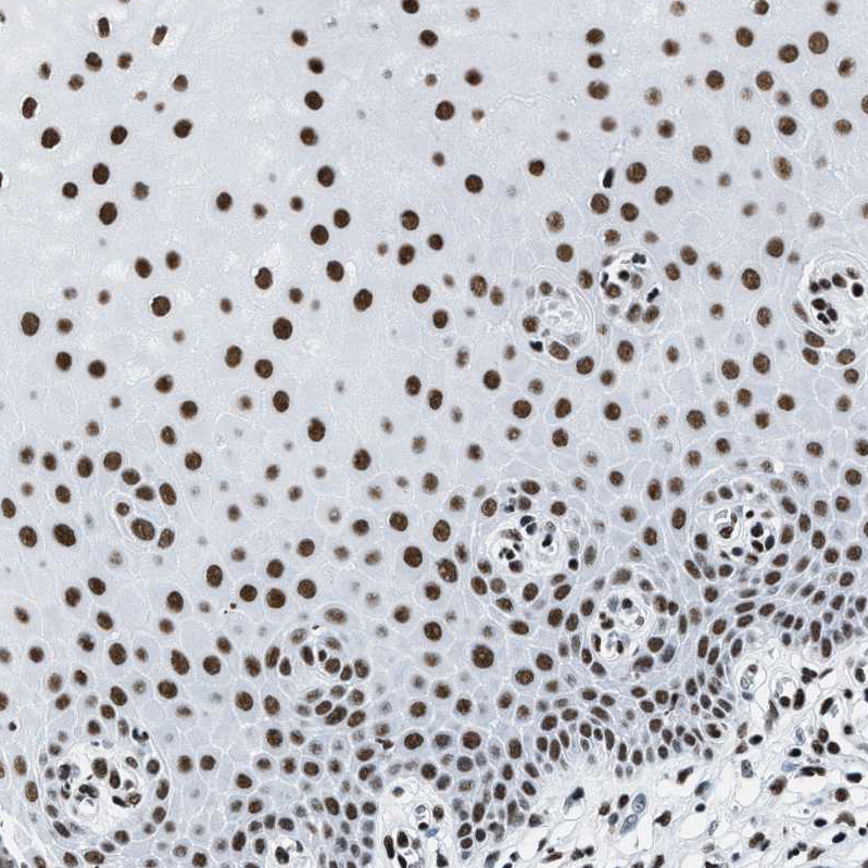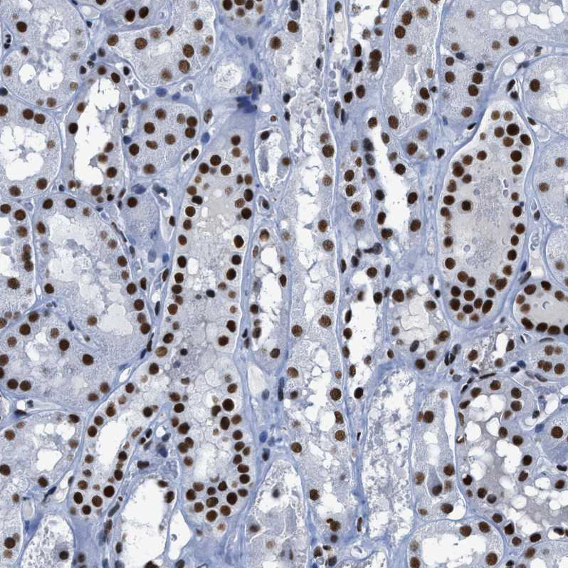 Immunohistochemical staining of human cerebral cortex shows strong nuclear positivity in glial cells.