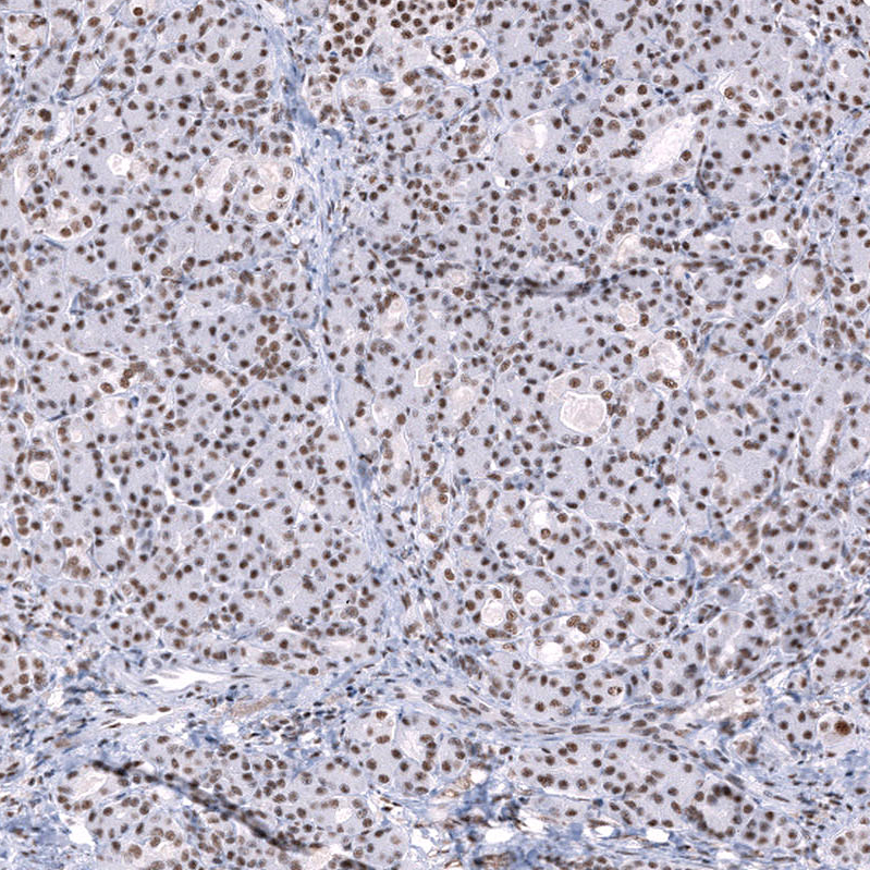 Immunohistochemical staining of human skin shows moderate nuclear positivity in squamous epithelial cells.
