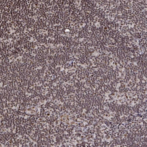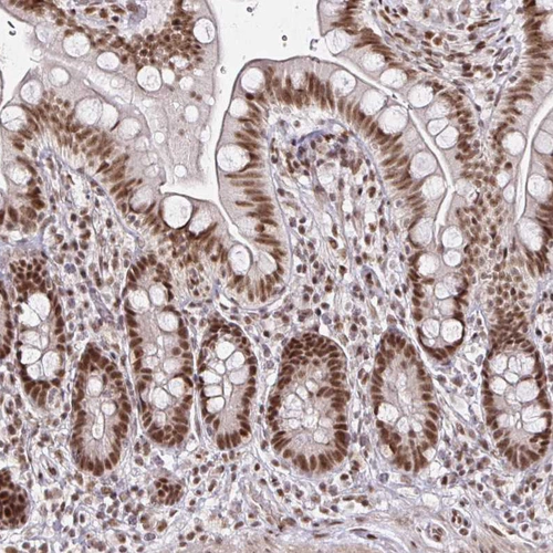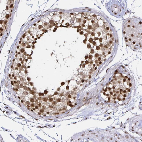 Immunohistochemical staining of human testis shows strong nuclear positivity in cells in seminiferous ducts.