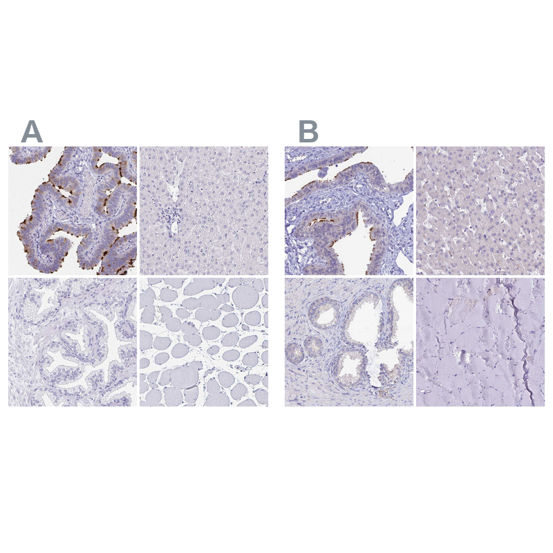 Immunohistochemistry analysis in human fallopian tube and prostate tissues using HPA058399 antibody. Corresponding SNTN RNA-seq data are presented for the same tissues.