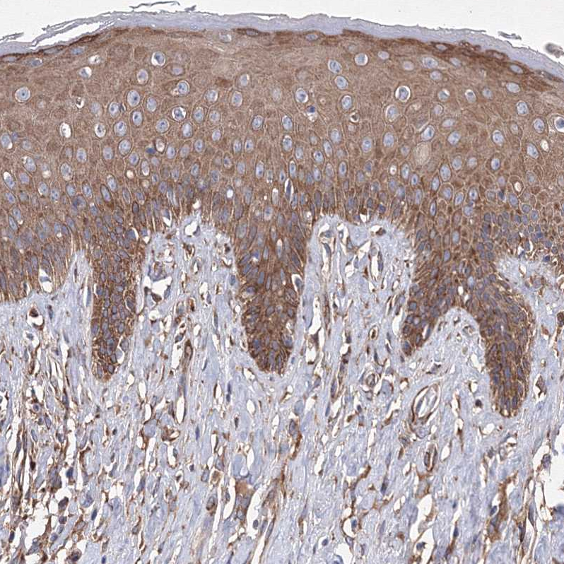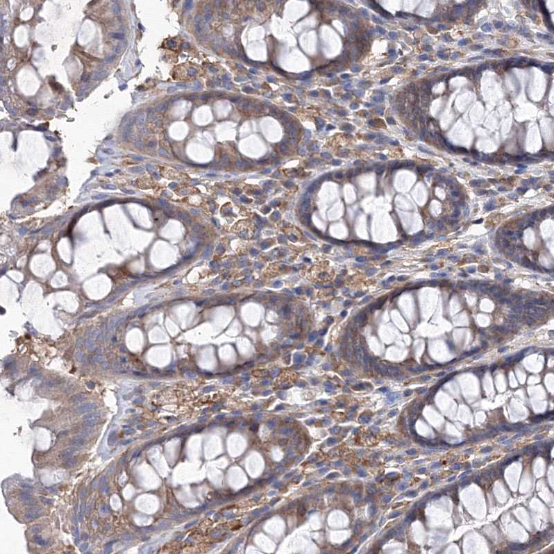 Immunohistochemical staining of human kidney shows strong cytoplasmic positivity in cells in tubules.