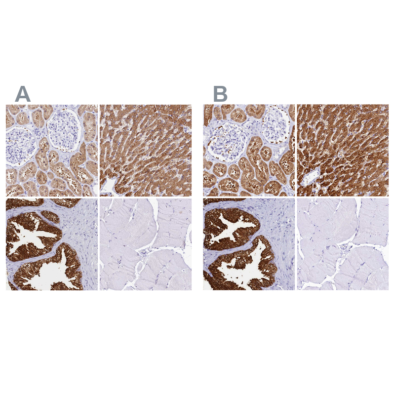 Immunohistochemistry analysis in human prostate and skeletal muscle tissues using HPA040621 antibody. Corresponding SORD RNA-seq data are presented for the same tissues.