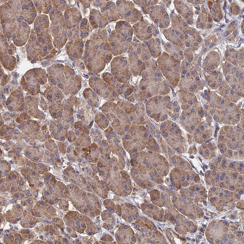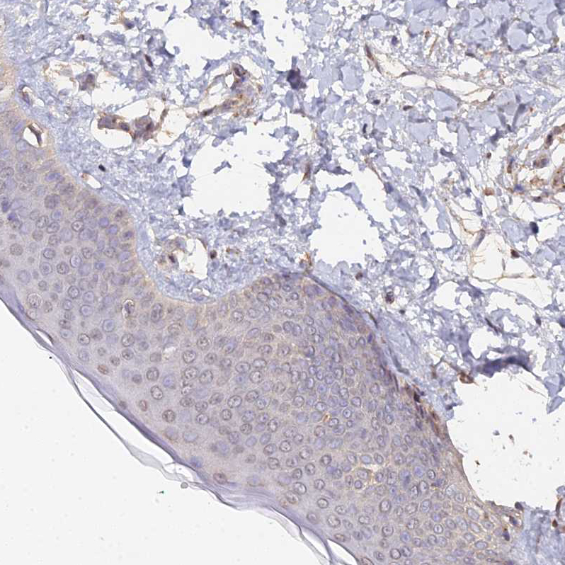Immunohistochemical staining of human testis shows moderate granular cytoplasmic positivity in cells in seminiferous ducts.