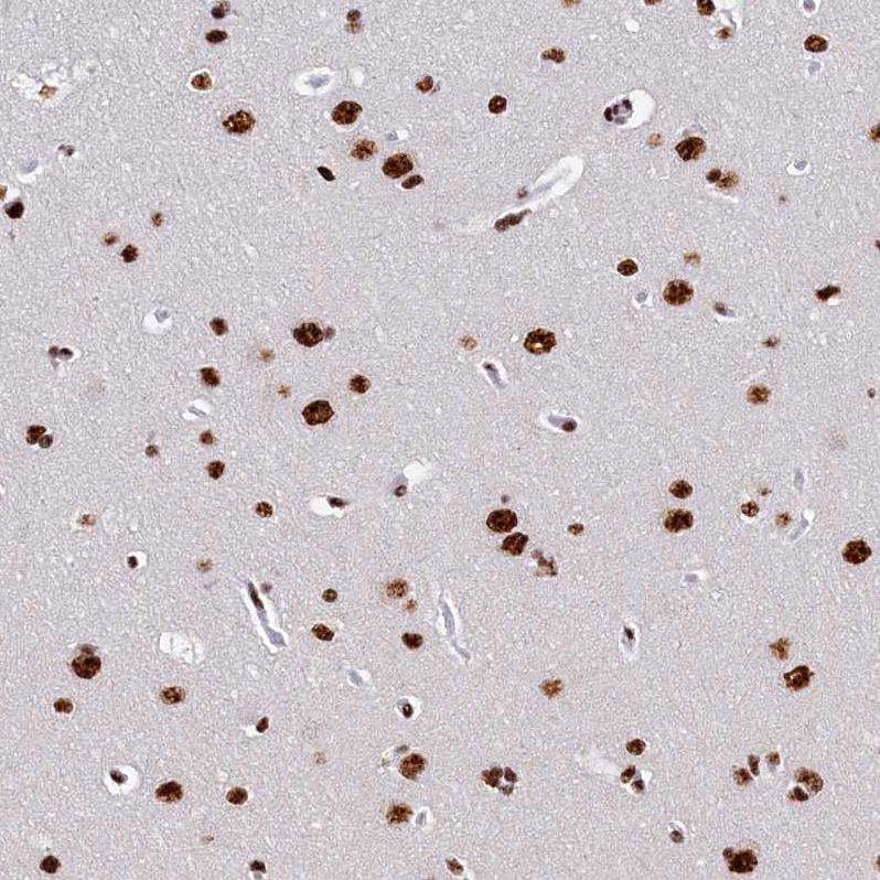 Immunohistochemical staining of human endometrium shows strong nuclear positivity in glandular cells.