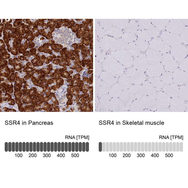 Immunohistochemistry analysis in human pancreas and skeletal muscle tissues using HPA045209 antibody. Corresponding SSR4 RNA-seq data are presented for the same tissues.