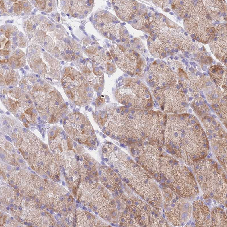 Immunohistochemical staining of human duodenum shows moderate cytoplasmic positivity in lymphoid cells.