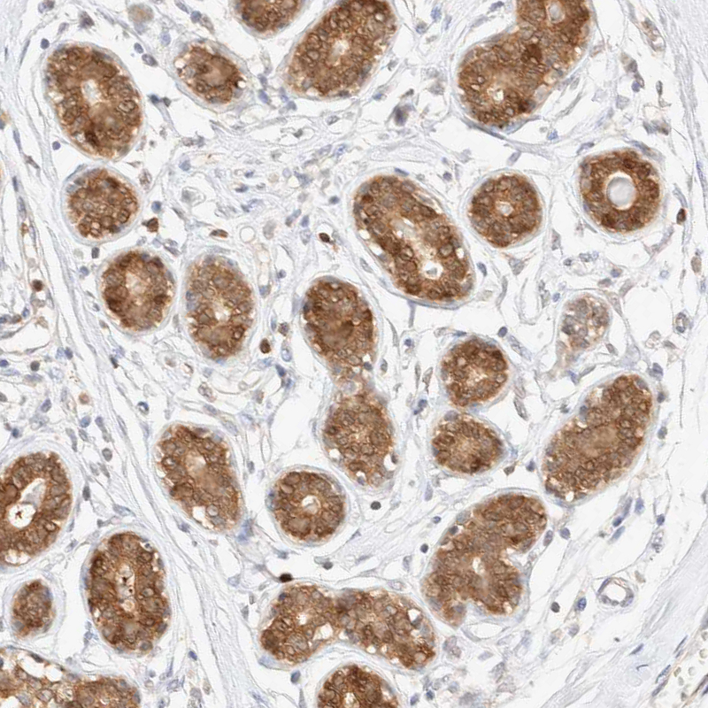 Immunohistochemical staining of human rectum shows moderate cytoplasmic positivity in glandular cells.