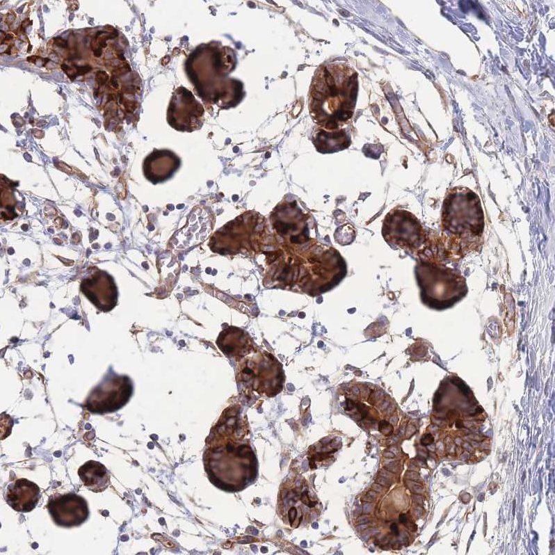 Immunohistochemical staining of human Liver shows strong membranous and cytoplasmic positivity in hepatocytes.