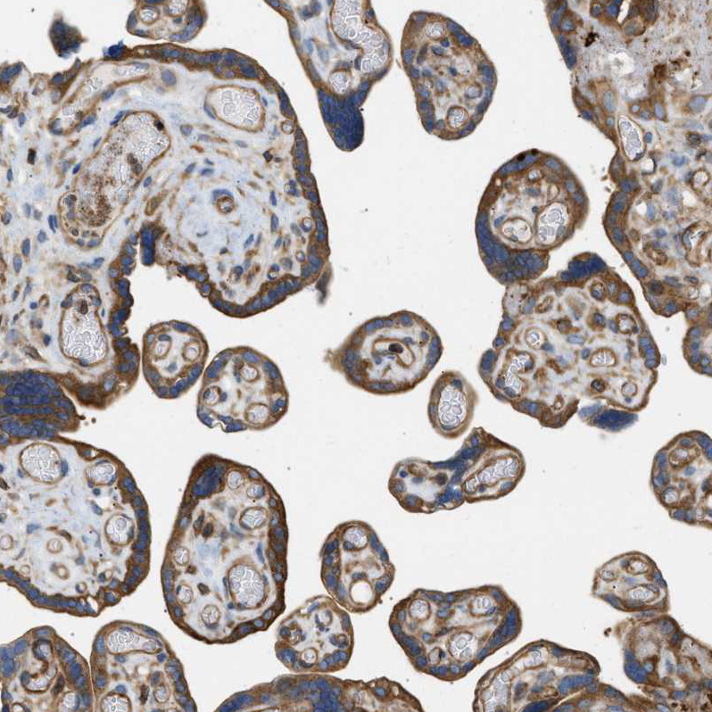 Immunohistochemical staining of human esophagus shows strong cytoplasmic positivity in squamous epithelial cells.