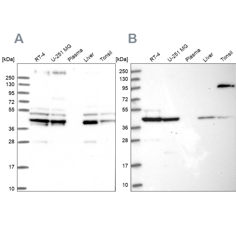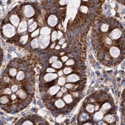 Immunohistochemical staining of human cerebral cortex, colon, kidney and lymph node using Anti-SUCLA2 antibody HPA039435 (A) shows similar protein distribution across tissues to independent antibody HPA039536 (B).