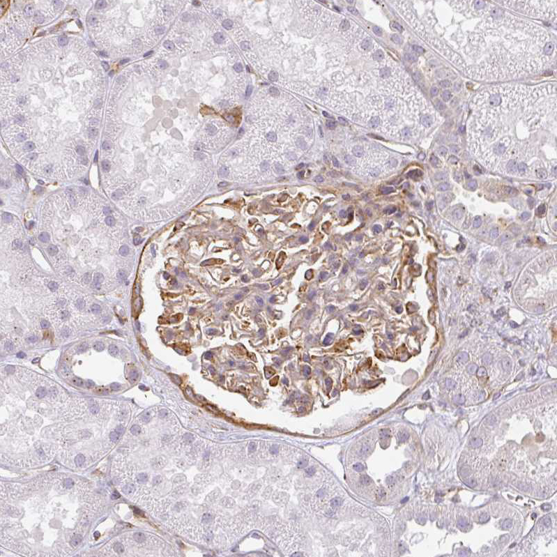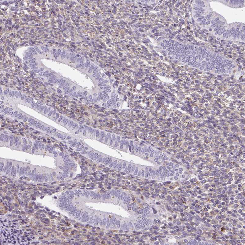Immunohistochemical staining of human prostate shows moderate cytoplasmic positivity in smooth muscle cells.