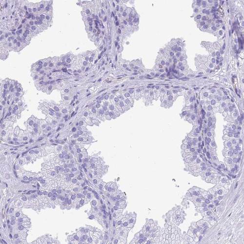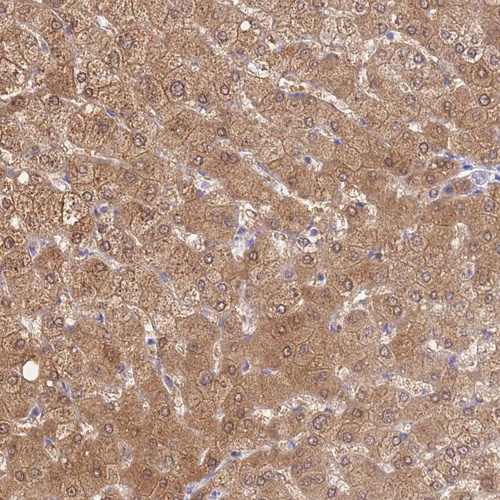 Immunohistochemical staining of human small intestine shows strong cytoplasmic positivity in glandular cells.