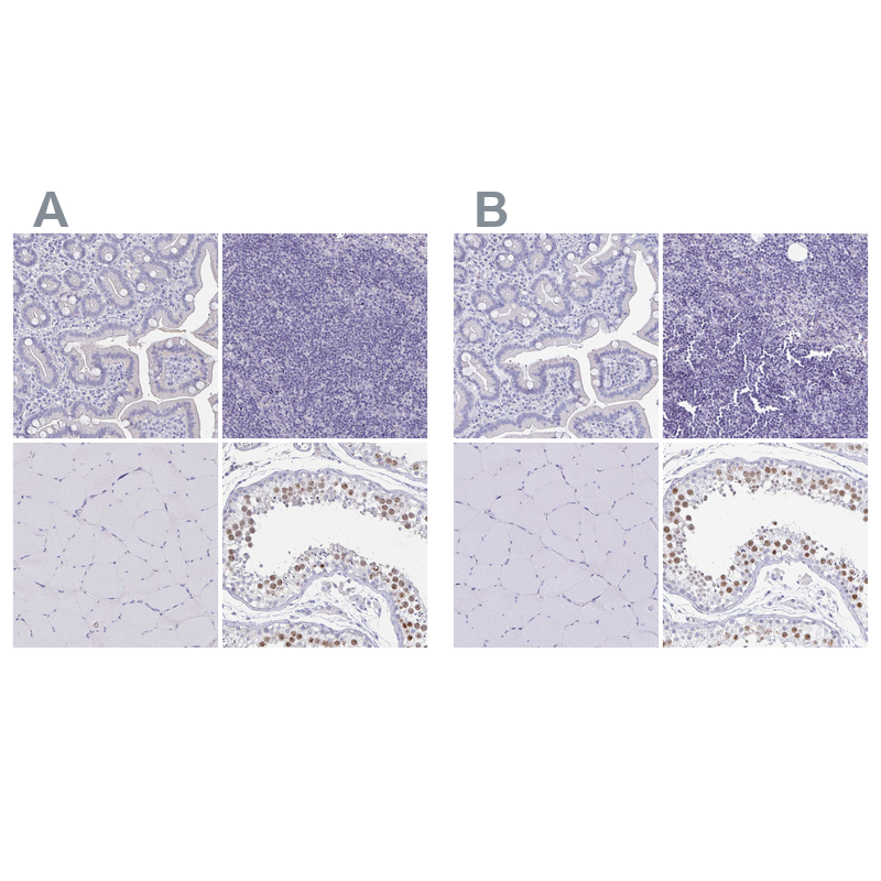 Immunohistochemistry analysis in human testis and skeletal muscle tissues using HPA043938 antibody. Corresponding SYCP3 RNA-seq data are presented for the same tissues.