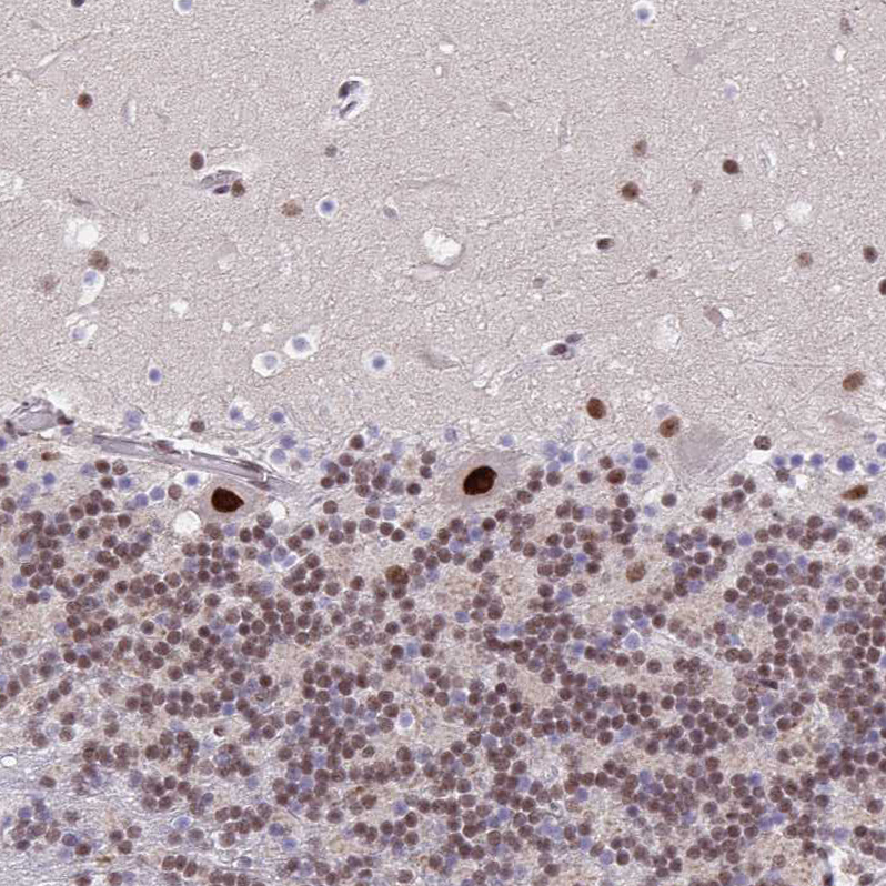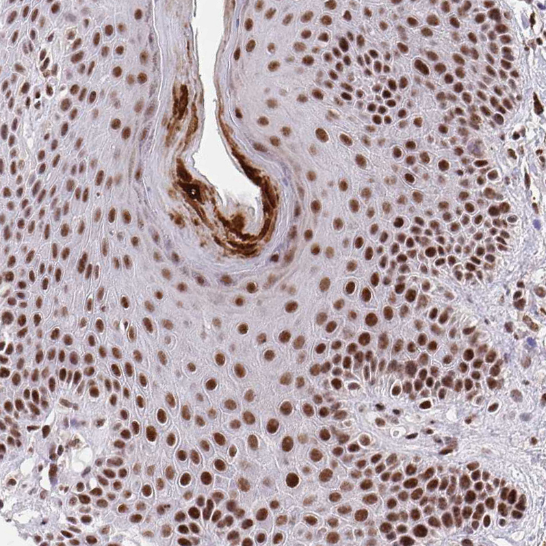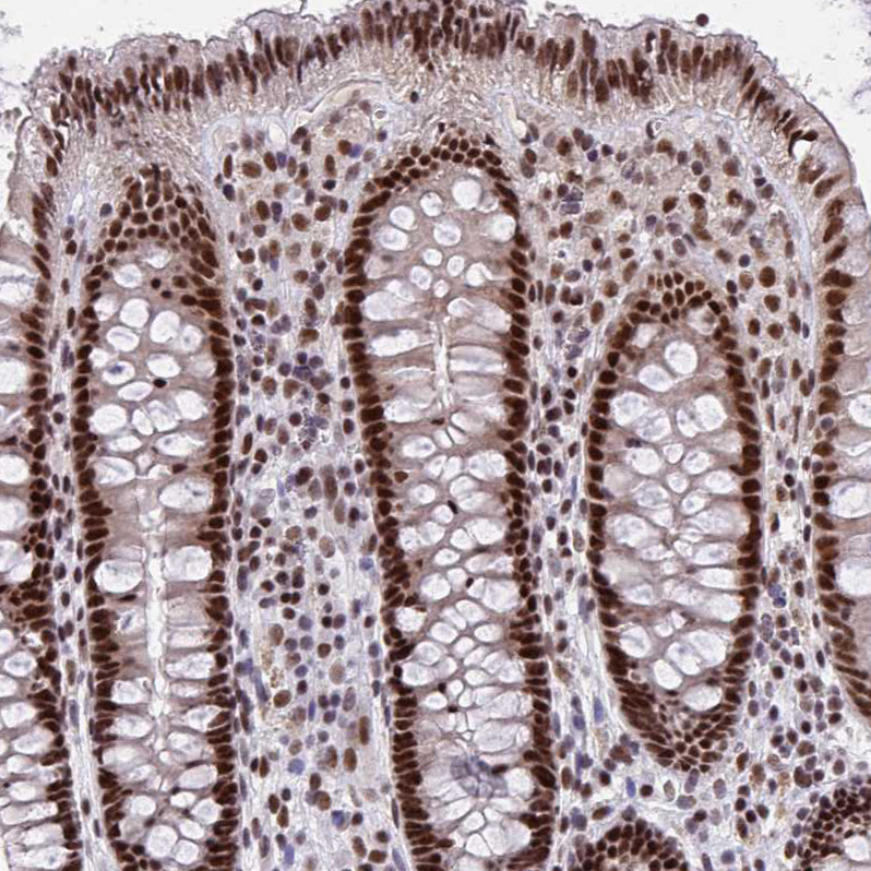 Immunohistochemical staining of human prostate shows strong nuclear positivity in glandular cells.