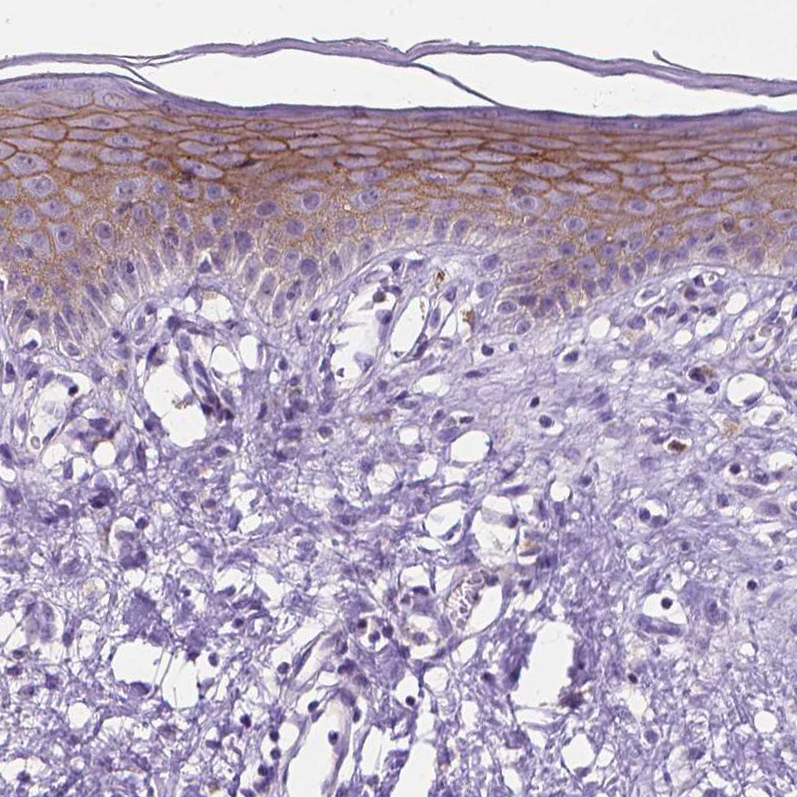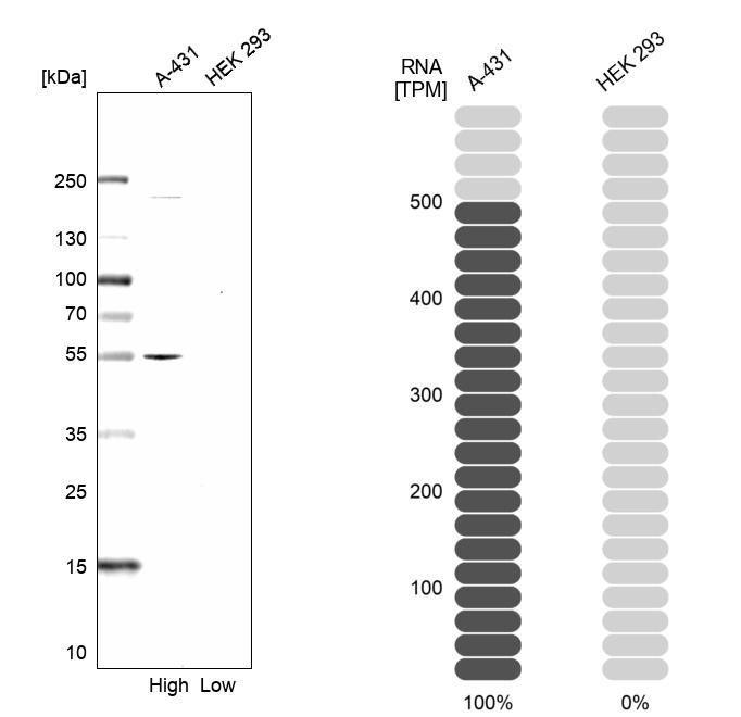 Immunohistochemistry analysis in human skin and liver tissues using HPA055067 antibody. Corresponding TACSTD2 RNA-seq data are presented for the same tissues.