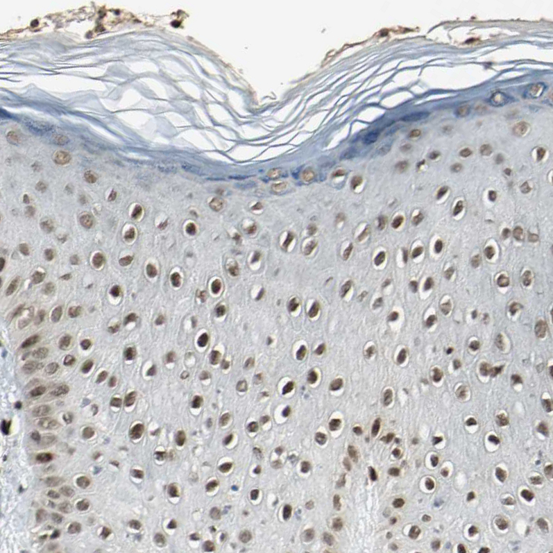 Immunohistochemical staining of human testis shows strong nuclear positivity in cells in seminiferous ducts.