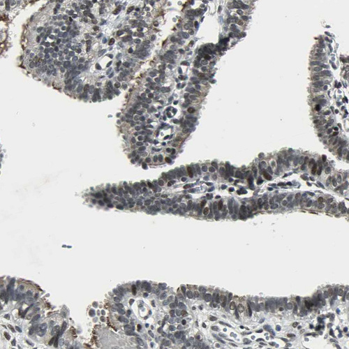 Immunohistochemical staining of human testis shows moderate nuclear positivity in cells in seminiferous ducts.