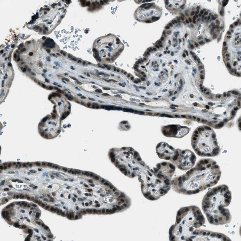 Immunohistochemical staining of human skeletal muscle shows strong nuclear positivity in myocytes.