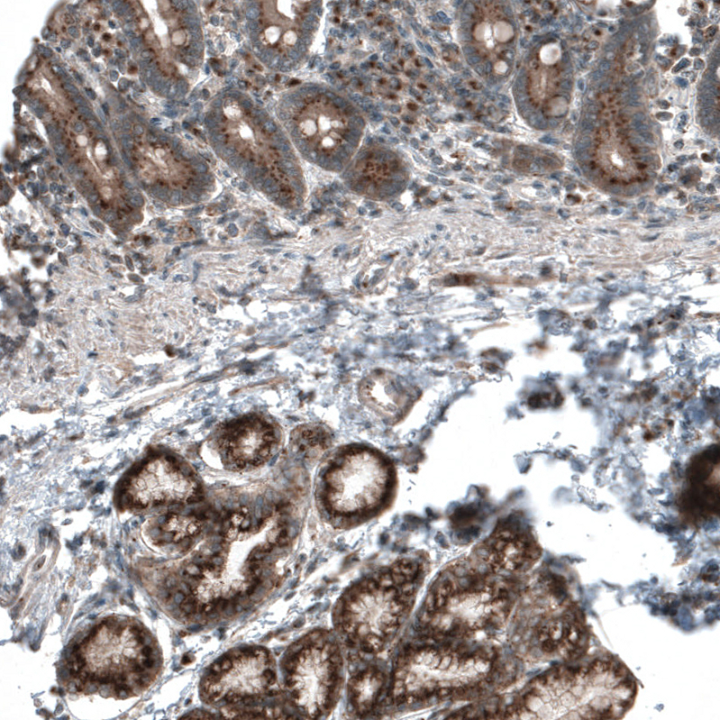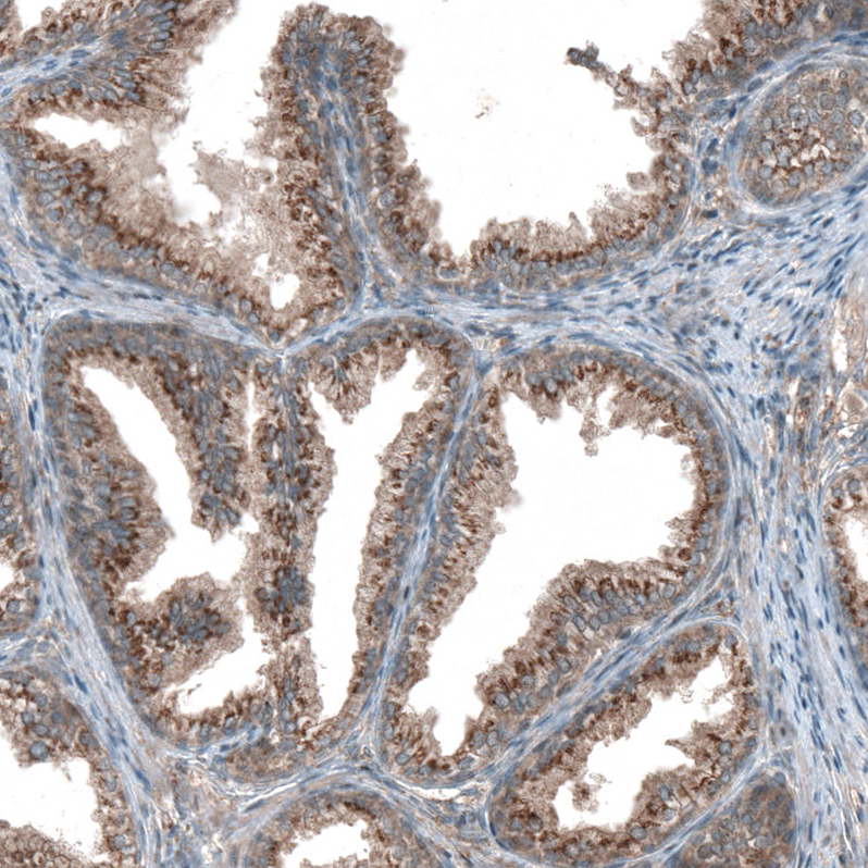 Immunohistochemical staining of human endometrium shows strong granular cytoplasmic positivity in glandular cells.