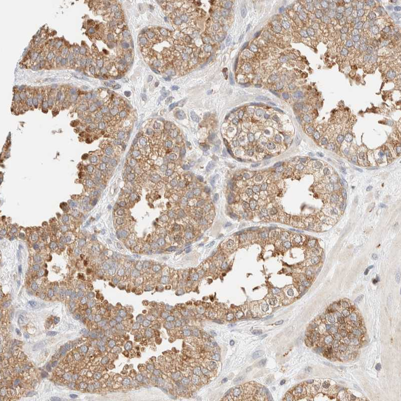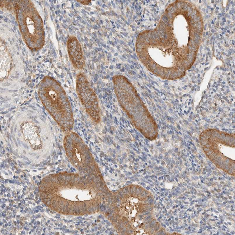 Immunohistochemical staining of human rectum shows strong cytoplasmic positivity in glandular cells.