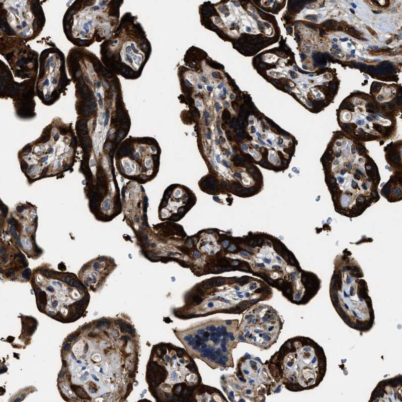 Immunohistochemistry analysis in human placenta and testis tissues using HPA021019 antibody. Corresponding TGM2 RNA-seq data are presented for the same tissues.