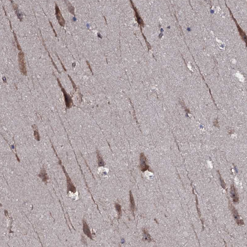 Immunohistochemical staining of human cerebral cortex shows weak cytoplasmic-membranous positivity in neurons.